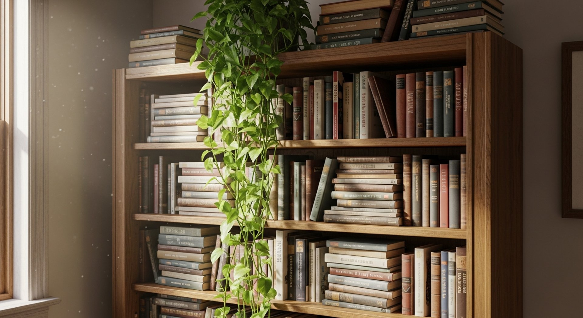 El Poto (Epipremnum aureum) es el rey indiscutible de este efecto por su resistencia y rápido crecimiento. Colócalo en lo alto de una librería o estantería y deja que sus guías caigan libremente, creando una cascada verde que aporta textura y una increíble sensación de abundancia.